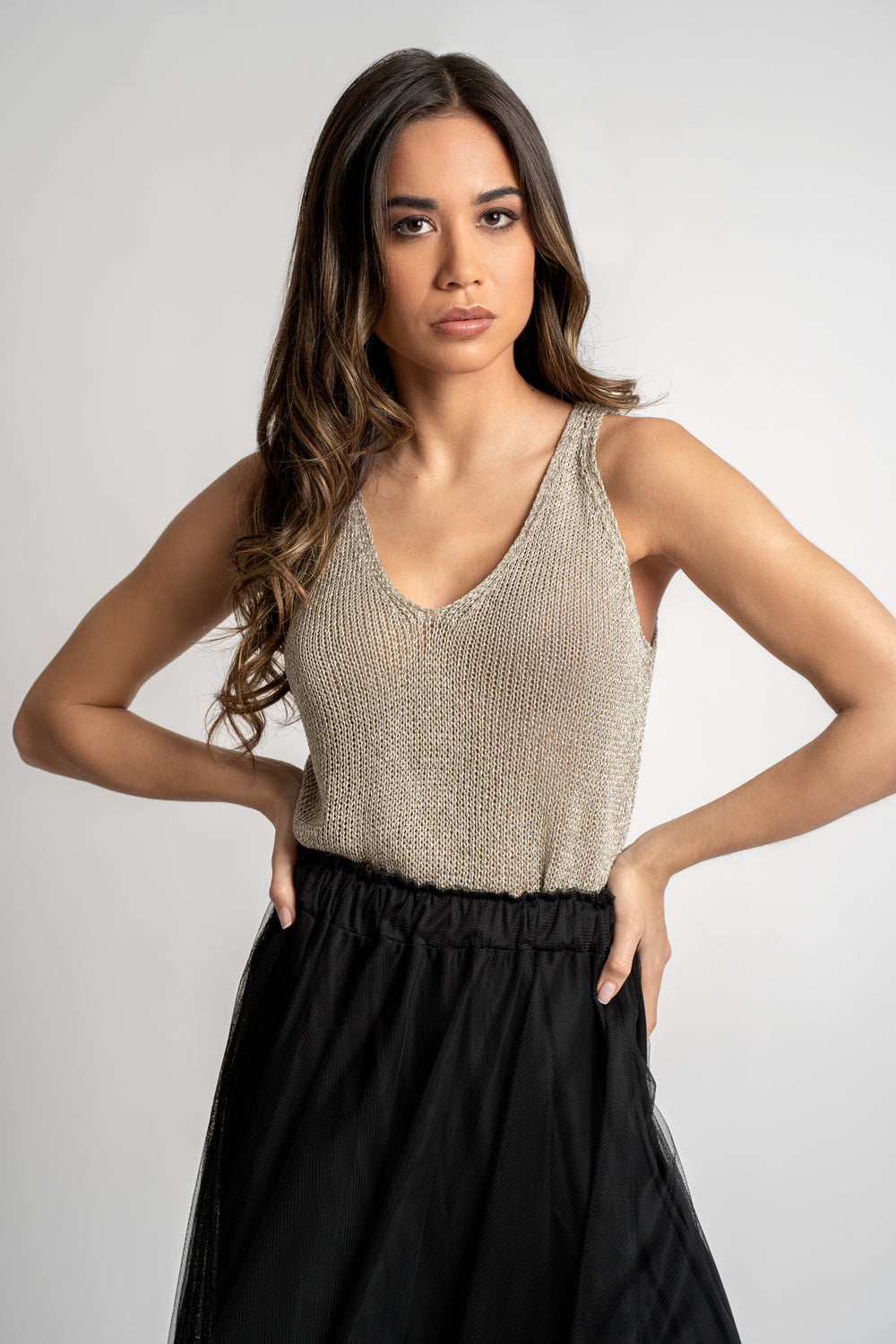 Brillez avec notre débardeur en maille lurex ! Ce débardeur étincelant est disponible en trois combinaisons de couleurs : kaki & silver, rose pâle & gold et bleu & silver. La maille lurex ajoute une touche scintillante à votre tenue. Ce débardeur est un choix parfait pour ajouter de l'éclat à votre style.