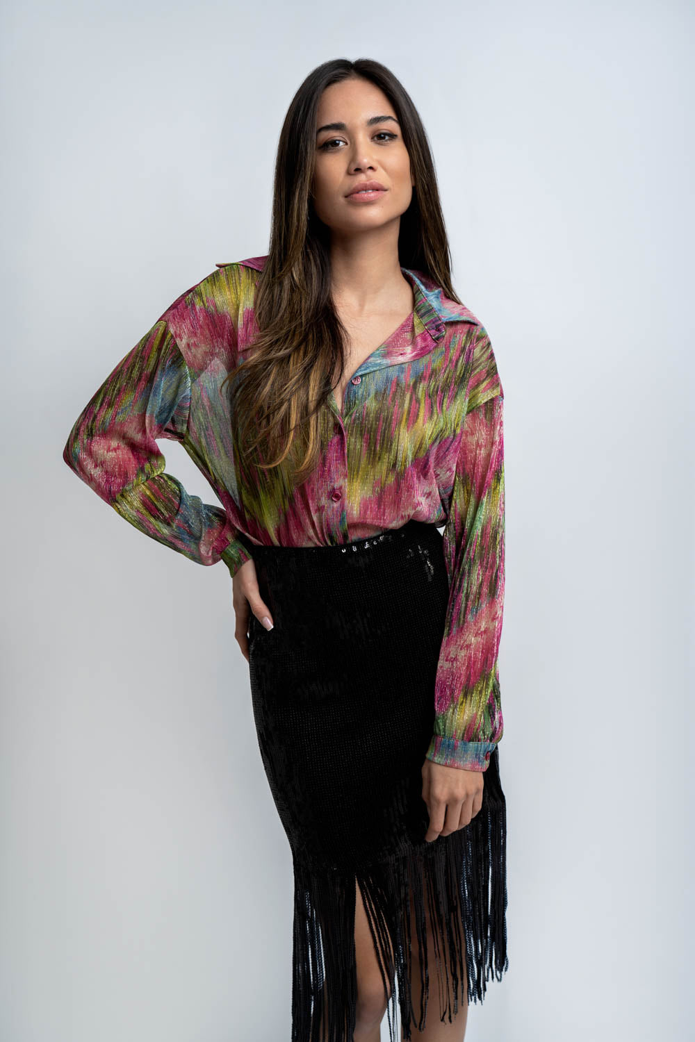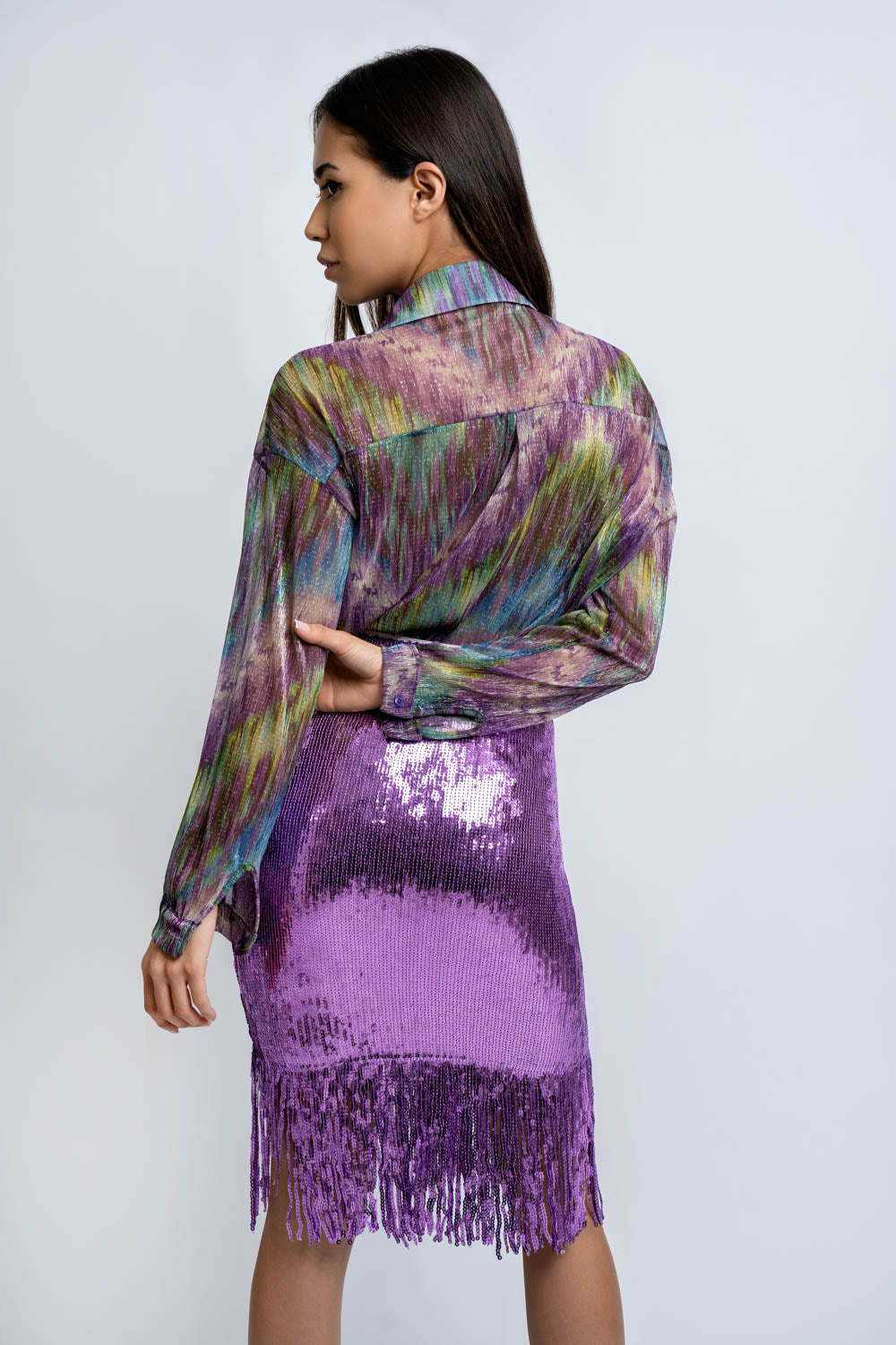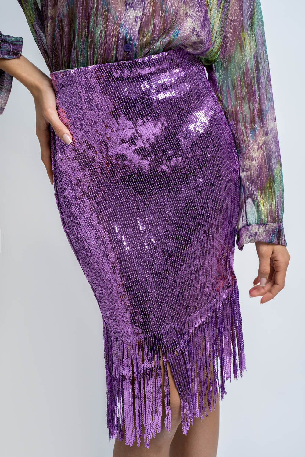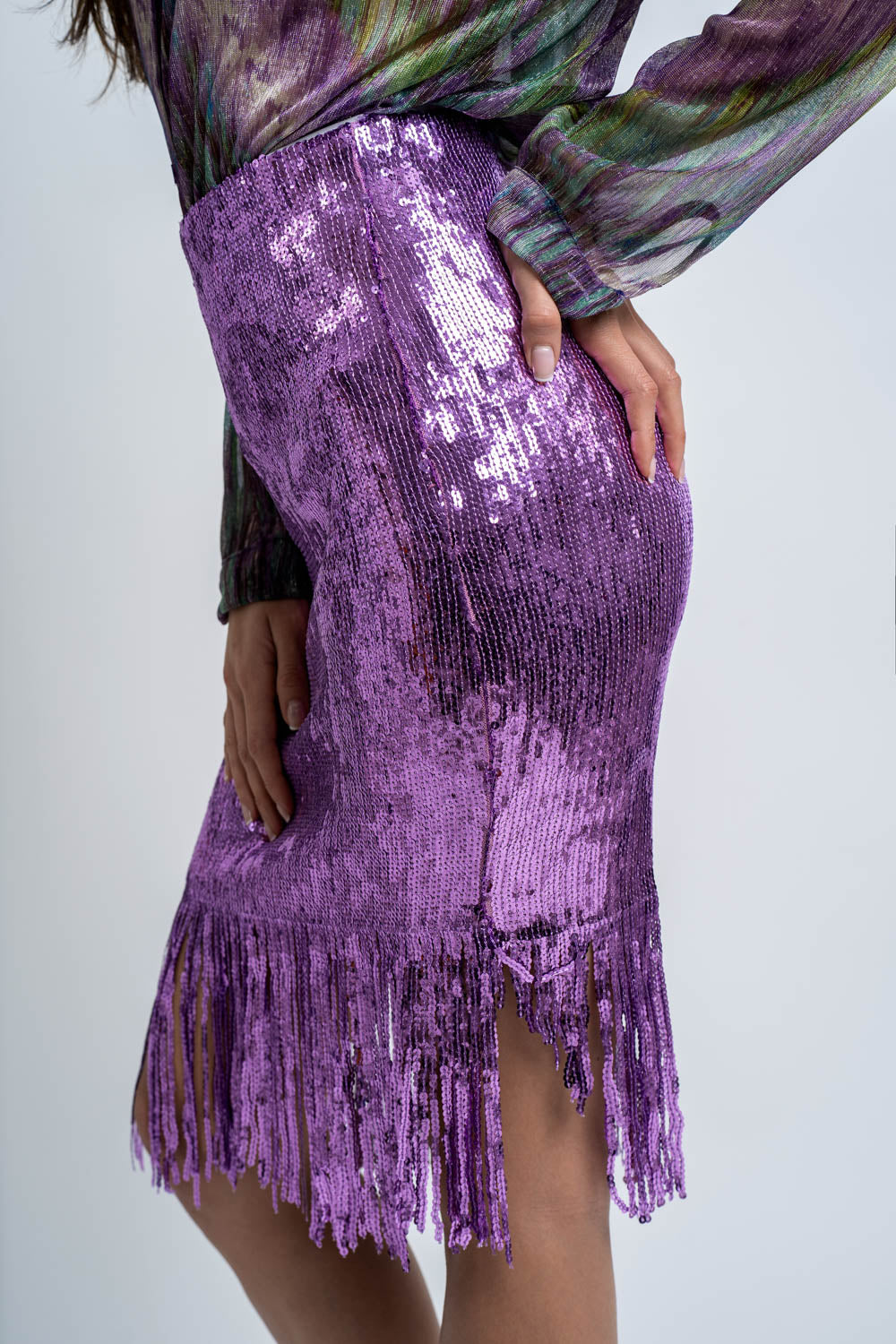 Faites sensation avec notre jupe à paillettes et franges ! Scintillante et ludique, cette jupe se pare de paillettes étincelantes et de franges dynamiques. Idéale pour les soirées, elle apporte une touche de glamour et de gaieté à votre look. Disponible en noir et Parme. Associez-la à un haut chic pour une allure pétillante et sophistiquée.