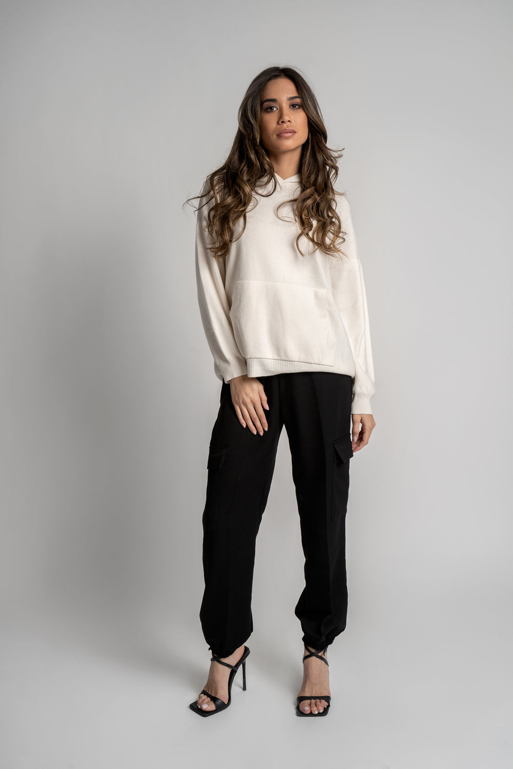 Optez pour un look décontracté avec notre pull sweatshirt à capuche, disponible en écru, rose pâle, camel et noir. Doté d'une poche pratique, ce pull en maille allie confort et style. Un choix idéal pour une allure cosy et tendance.