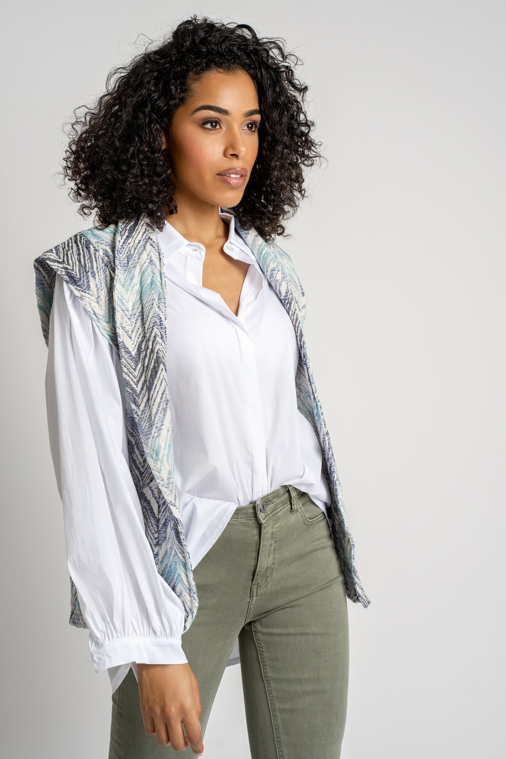 Apportez une touche de fraîcheur à votre tenue avec notre veste sans manche imprimée ! Disponible en combinaisons blanc & bleu et blanc & camel. Un choix idéal pour rehausser votre look avec style et originalité.